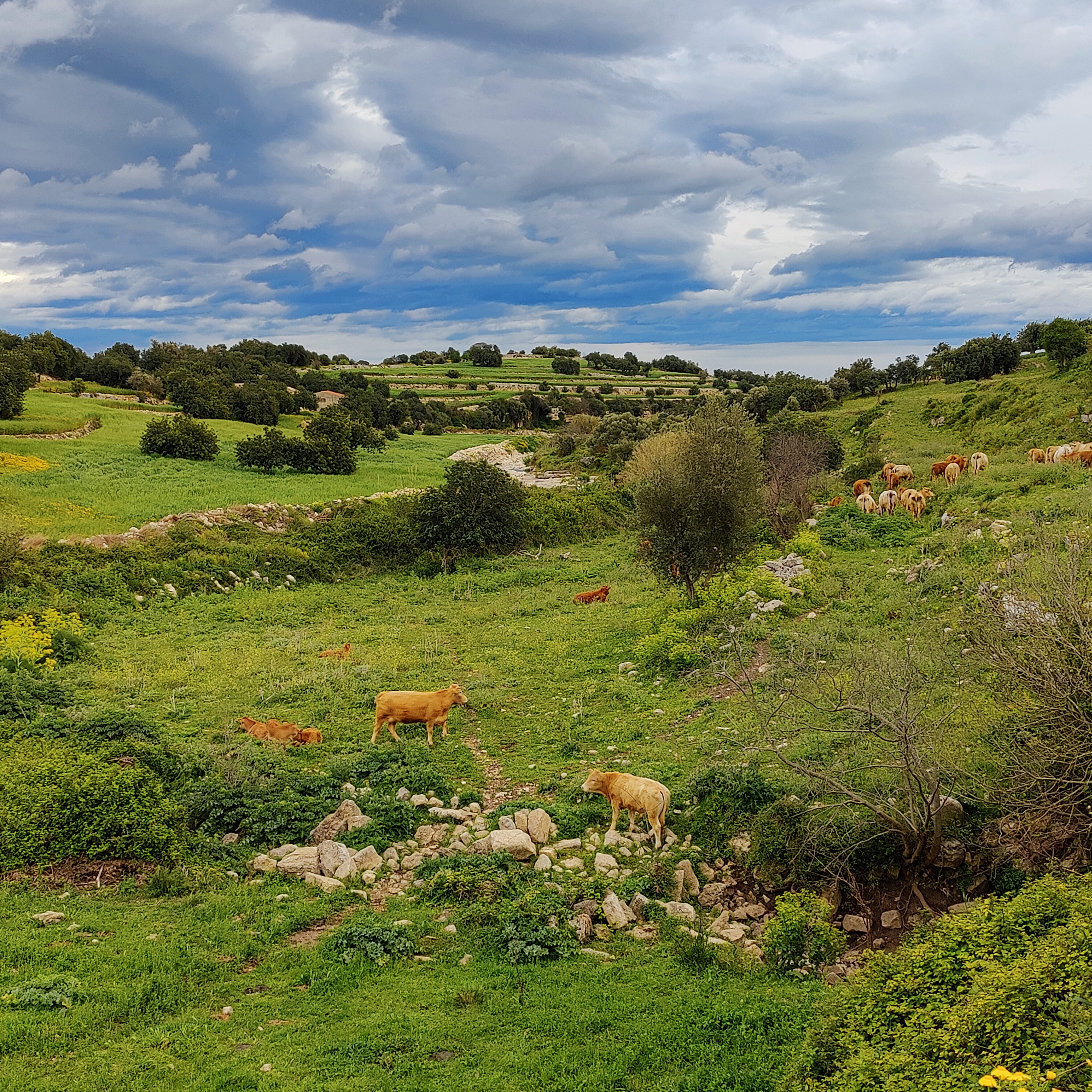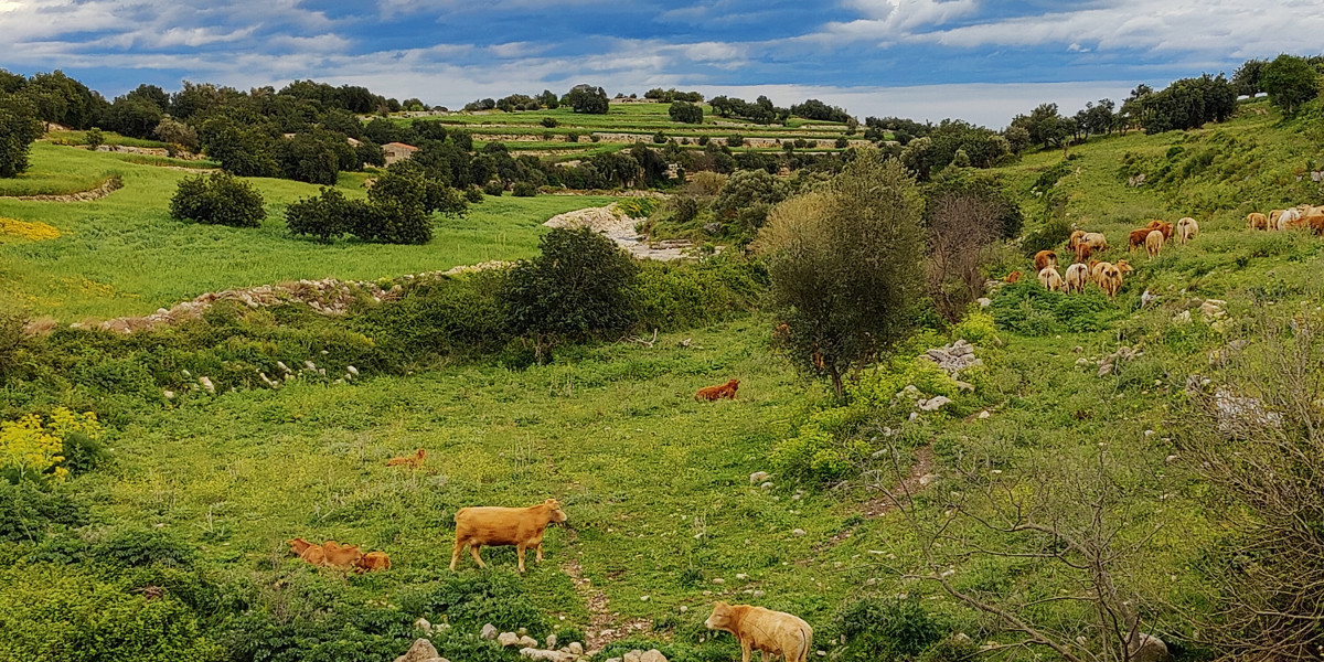 La campagne est sicilienne est escarpée. Pas de pâture ailleurs que dans des reliefs escarpées. On voit donc le bétail partout. Sur des crêtes escarpées, dans des champs de 1ha, dans des parcelles de fleurs des champs...