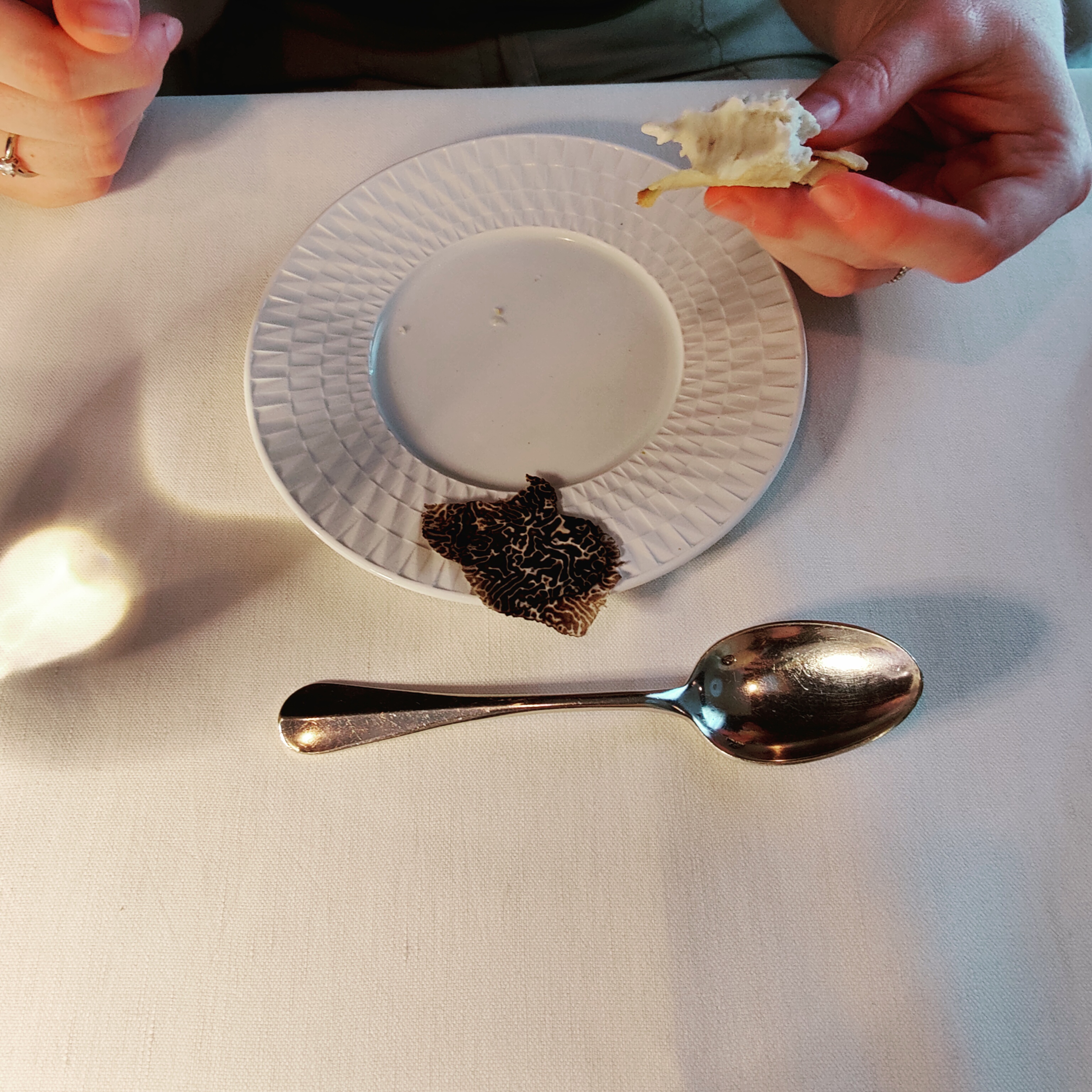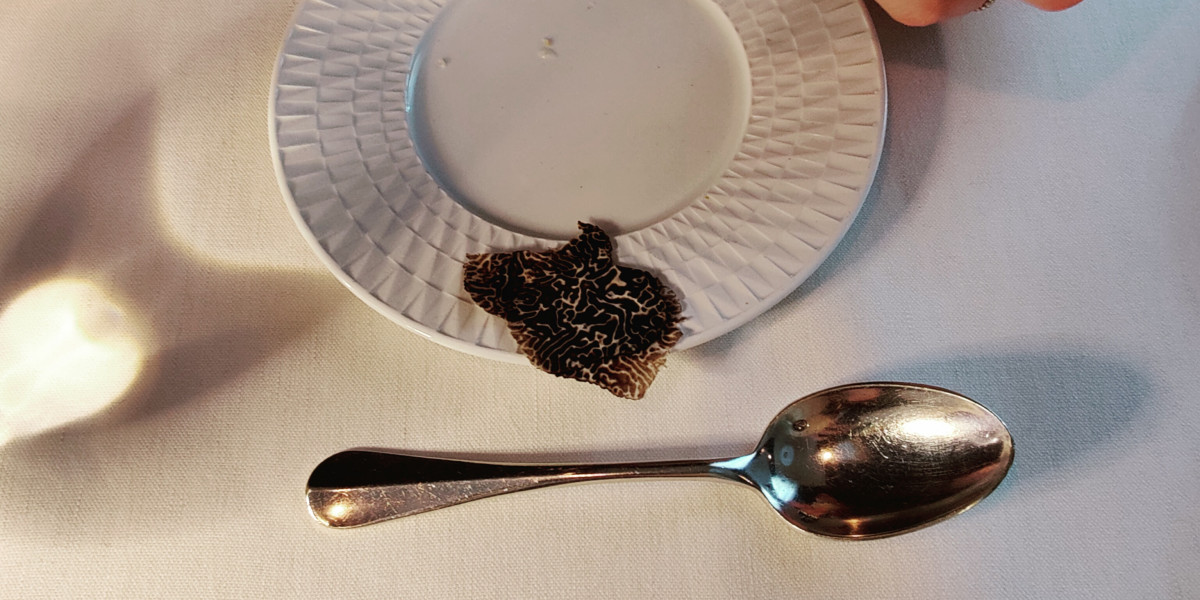 Parfait. Deux amuses bouches : un artichaut et une olive recomposée Spaghetti al verde avec un sashimi de thon et une sauce de carottes Bouchée croquante au sorbet à la truffe de Sicile Echine de porc noir avec ses légumes. Patisserie autour des fruits secs, du chocolat et du citron.